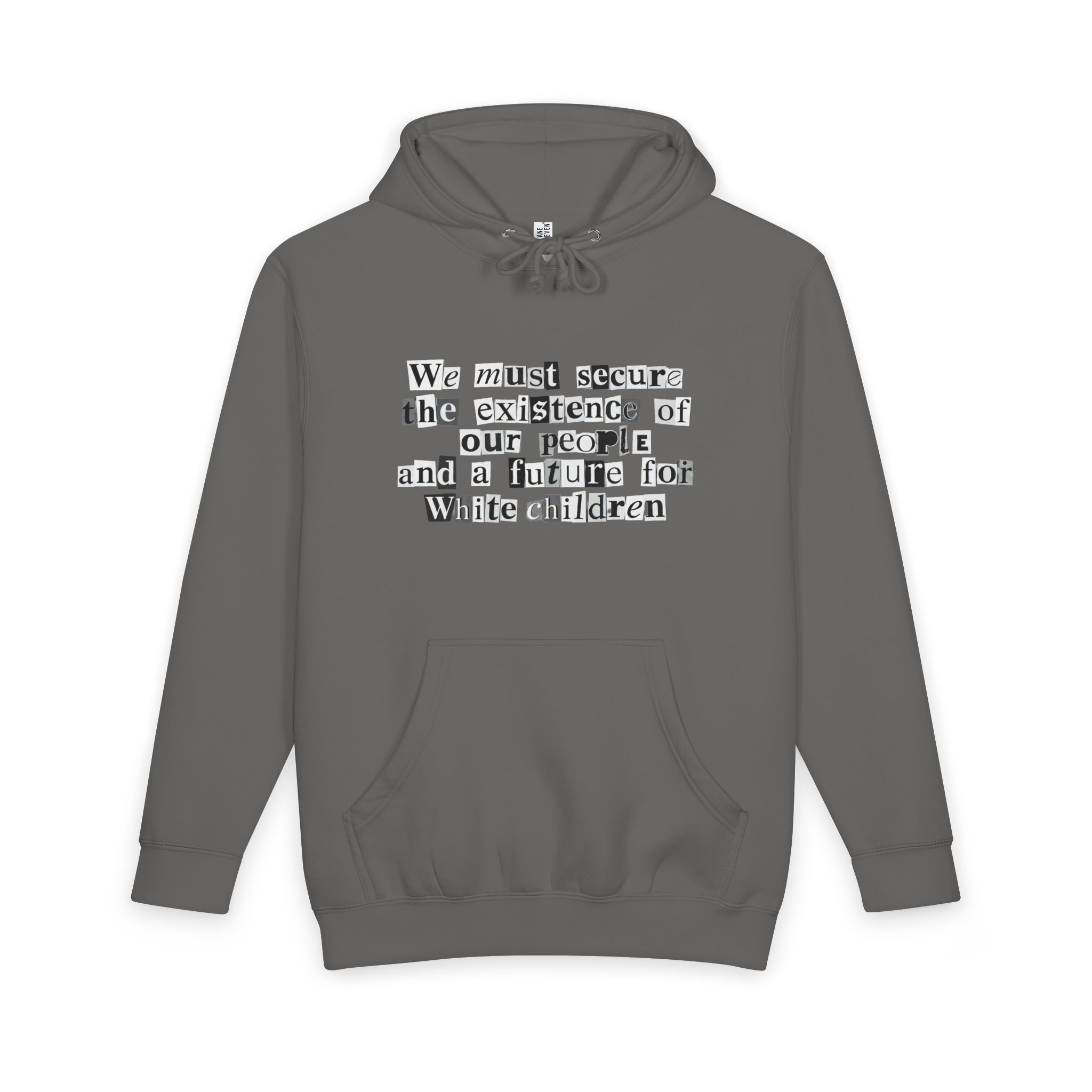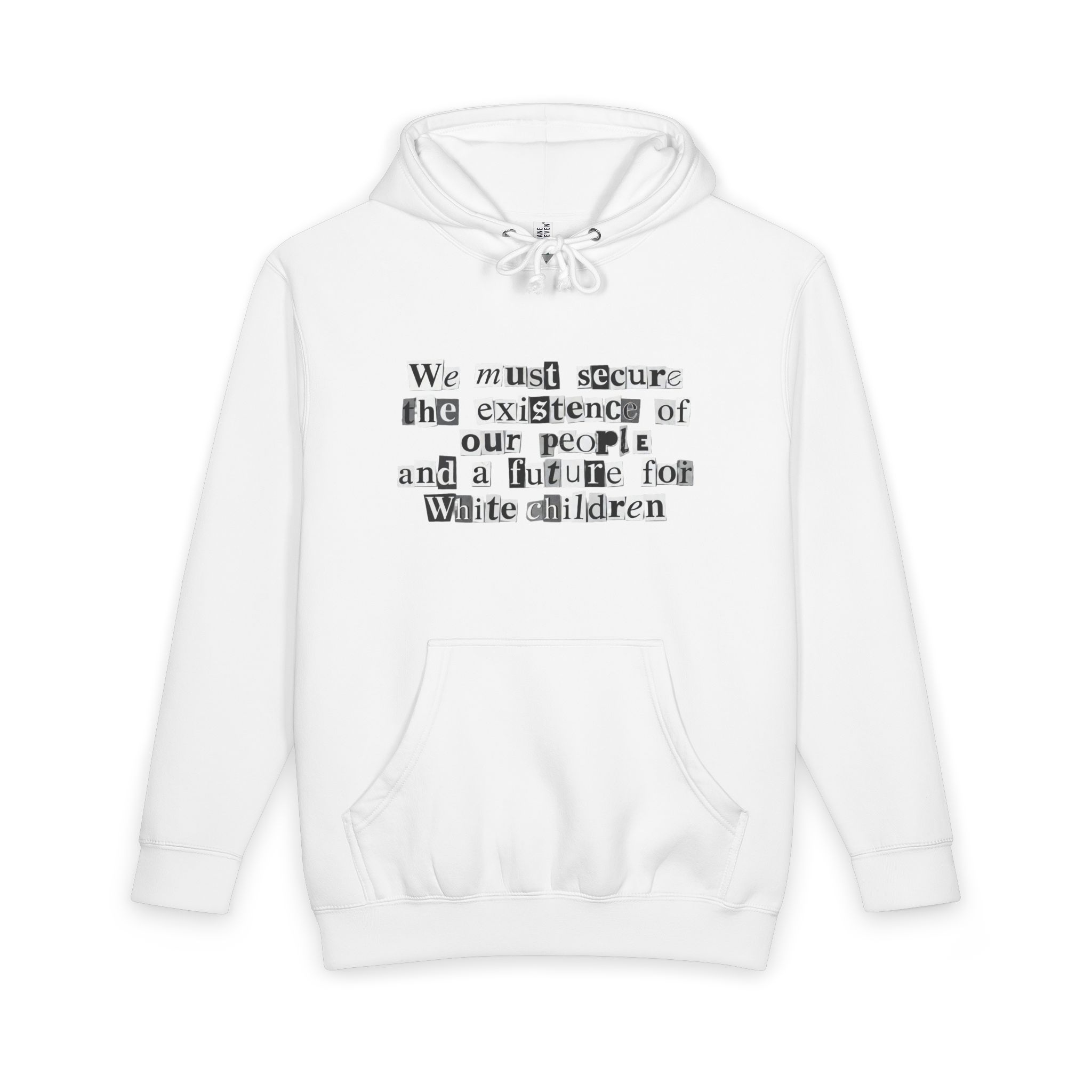 Hoodie with a stark, statement-style text across the chest. The layout uses a distressed typewriter font and a centered block of words presented in black on white, giving a raw, archival feel. The heavy-weight fabric and lined three-panel hood make this piece feel substantial and enveloping. Wear it when you want clothing that reads like a provocation — something that sits quietly in a room until someone reads it and the conversation starts. It moves with you: the roomy kangaroo pocket and ribbed cuffs hold shape after wear, and the soft fleece inside keeps the silhouette warm without bulk. This is for someone who layers message with material, who values durable construction and a look that evokes found-text aesthetics and stark, intentional contrast.